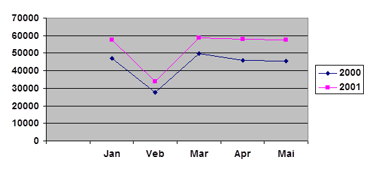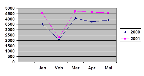 Сравнивая 2000 с 2001 годом, то картина получается такая, что в январе и марте безработица увеличилась в несколько раз, а что касается февраля, то практически ничего не изменилось. Что и в 2000 г. а в апреле и мае безработных людей стало больше.