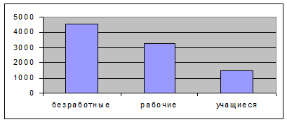 Из осужденных 4510 человек - безработные, 3228 - рабочие и 1453 - учащиеся. 3976 человек совершили преступления в пьяном виде. На рисунке видно, что большее число преступлений приходится на безработных.