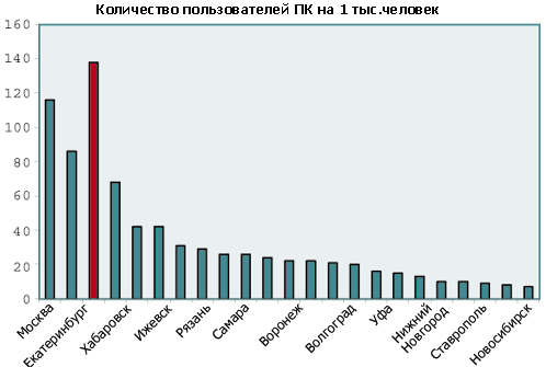 Верхние строчки рейтинга компьютеризированных (на душу населения) городов, после лидирующих Екатеринбурга, Москвы и Санкт-Петербурга, занимают Томск и Хабаровск. В первую двадцатку этого хит-парада попали также Челябинск, Омск и Новосибирск.