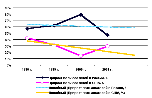 Таблица 1. Изменение прироста пользователей в США и России в 1998-2001 гг. | ||||||||||||||||||||||||||||||