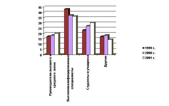 Рисунок 4. Распределение пользователей по виду занятости и должностному статусу в 1999-2001 гг. | ||||||||||||||||||||||||||||||