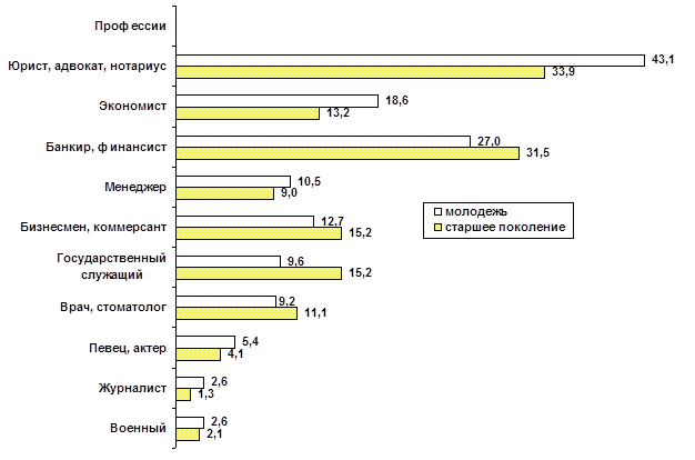 Какие профессии считают в настоящее время наиболее престижными молодое и старшее поколения, в %