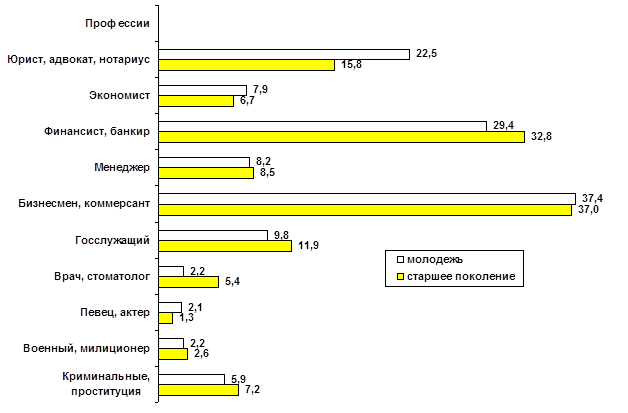 Как видно, наиболее прибыльной молодые россияне считают профессию бизнесмена. Однако в рейтинге престижных профессий она заняла лишь четвертое место. Первые три принадлежали профессиям высококвалифицированного умственного труда — юрист, финансист, экономист. Таким образом, хотя доходность и престижность профессий имеют значительную степень корреляции, но не только прибыльность профессии определяет степень её престижности. Не случайно профессии юриста или экономиста престижной считают вдвое больше тех, кто убежден в их прибыльности.