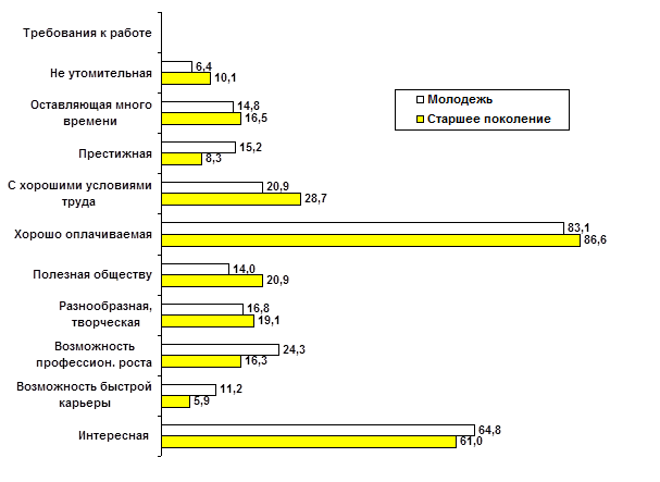 О том, что такой вывод носит достаточно обоснованный характер, говорит и анализ результатов выбора одного из двух основных требований к работе при ответе на альтернативный вопрос — либо интересная работа, либо высокий заработок. Среди молодежи интересную работу высокому заработку предпочли 59,0%, а среди старшего поколения — 53,0%. Как видим, и здесь показатели очень близки, но все же материальные факторы для молодежи чуть менее значимы, чем для представителей старшего поколения.