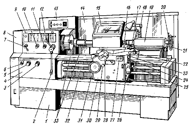 Рукоятки управления: 2 - сблокированная управление, 3,5,6 - установки подачи или шага нарезаемой резьбы, 7, 12 - управления частотой вращения шпинделя, 10 - установки нормального и увеличенного шага резьбы и для нарезания многозаходных резьб, 11 – изменения направления нареза-ния резьбы (лево- или правозаходной), 17 - перемещения верхних салазок, 18 - фиксации пиноли, 20 - фиксации задней бабки, 21 - штурвал перемещения пиноли, 23 - включения ускоренных перемещений суппорта, 24 - включения и выключения гайки ходового винта, 25 - управления изменением направления вращения шпинделя и его остановкой, 26 - включения и выключения подачи, 28 - поперечного перемещения салазок, 29 - включения продольной автоматической подачи, 27 - кнопка включения и выключения главного электродвигателя, 31 - продольного перемещения салазок; Узлы станка: 1 - станина, 4 - коробка подач, 8 - кожух ременной передачи главного привода, 9 - передняя бабка с главным приводом, 13 - электрошкаф, 14 - экран, 15 - защитный щиток, 16 - верхние салазки, 19 - задняя бабка, 22 - суппорт продольного перемещения, 30 - фартук, 32 - ходовой винт, 33 - направляющие станины.