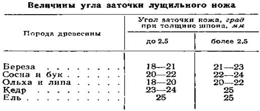 В таблице приведены величины угла заточки, рекомендуемые ЦНИИ фанеры для различных пород древесины и равных размеров толщины шпона.