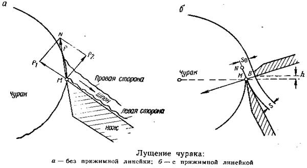 Для правильного ведения процесса лущения особенно большое значение имеет величина заднего угла резания а. Она должна быть небольшой и не должна выходить за пределы допуска. При слишком большом заднем угле на кромку ножа действуют большие опрокидывающие моменты, в связи с чем суппорт подвергается вибрации и шпон получается низкого качества, с рифленой поверхностью. Кроме того, вследствие значительного отгибания шпона на обратной его стороне появляются многочисленные поверхностные трещины. При малой величине заднего угла резания увеличивается давление на нож со стороны материала. Под влиянием давления чурак выгибается или раскалывается, а шпон получается «горбатым». Особенно это наблюдается при уменьшении диаметра чурака. Величина заднего угла должна быть прямо пропорциональна диаметру чурака; чем больше диаметр последнего, тем больше должен быть задний угол.