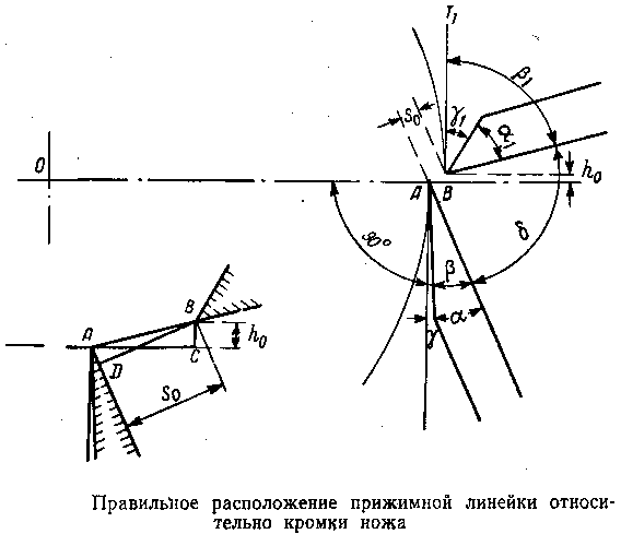 Как указывалось, высота линейки над ножом должна быть такой, чтобы давление от нажимной кромки линейки точно проходило через режущую кромку ножа. Просвет между линейкой и ножом измеряется по перпендикуляру BD, опущенному из нажимной кромки линейки на переднюю грань ножа. Высота линейки над ножом ho равна ВС— вертикальному расстоянию нажимной кромки от линии, являющейся продолжением радиуса чурака, проходящего через режущую кромку ножа А; ВС перпендикулярно АС,