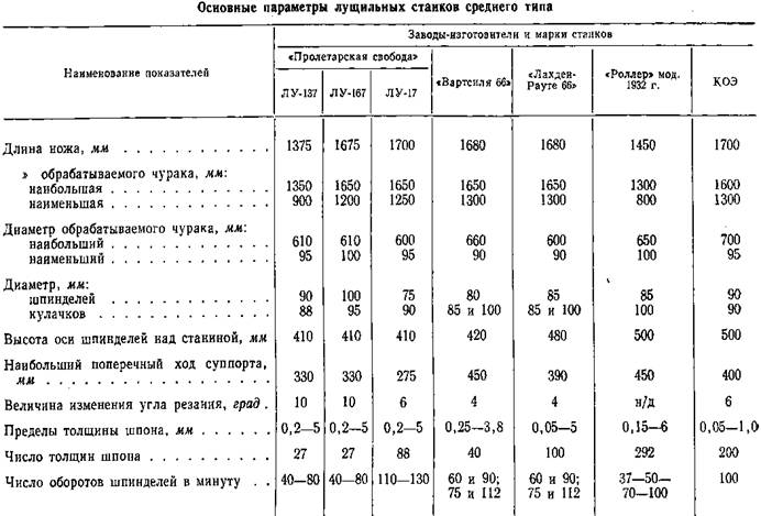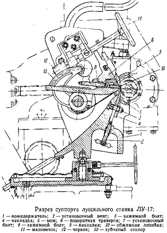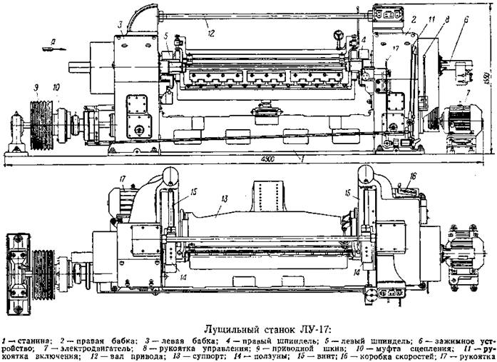 При лущении чурака его вставляют между шпинделями и зажимают с торцов. В момент установки чурака суппорт отводится от шпинделей на максимальное расстояние. Приводя в движение через муфту включения шпиндели, на ускоренной подаче подводят к чураку суппорт с ножом и одновременно производят дожим чурака шпинделем.