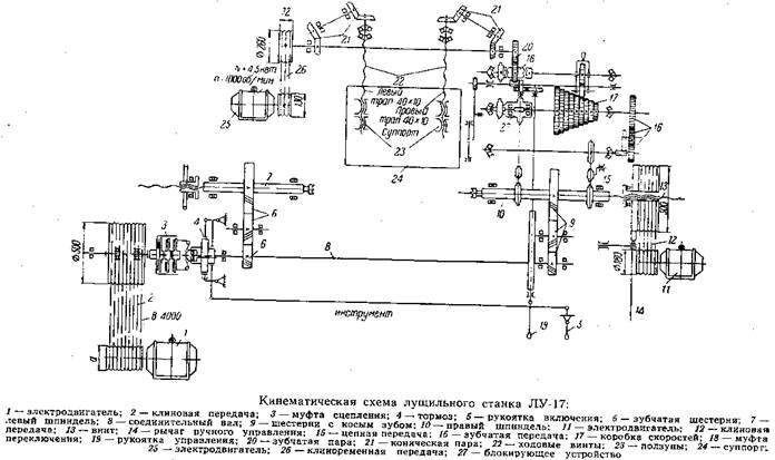 По прекращении лущения суппорт останавливают, прекращают вращение шпинделей, суппорт отводят в исходное положение и освобождают станок от карандаша.
