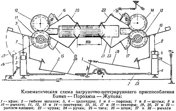 При включении в действие приспособления посредством педали воздух подается через кран 1 по гибким шлангам 2 в цилиндры 3 и 4 и (поднимает поршни 5 и б, которые через штоки 7 и 8 и рычаги 9 и 10 поворачивают шестерни 11, 12, 13 и 14 с помощью секторов 15, 16, 17 и 18. Связанные с секторами рычаги-клешни 19, 20, 21 и 22 поднимают и центрируют