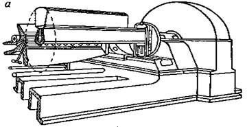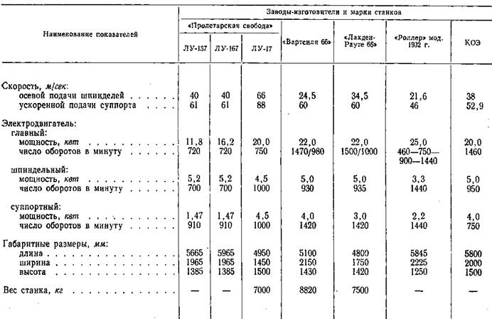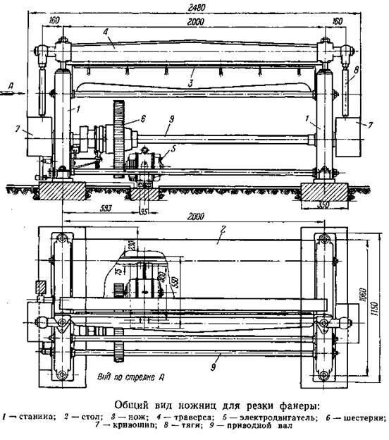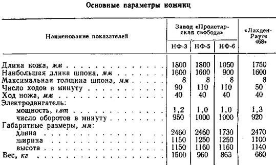 На рисунке приведен общий вид ножниц для резки шпона, а в таблице приведена техническая характеристика фанерных ножниц отечественного и заграничного производства.