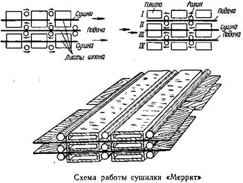 Устройство сушилки «Меррит» основано на принципе дыхательного пресса, с тем отличием, что здесь шпон принудительно движется при помощи приводных роликов. Из схемы,