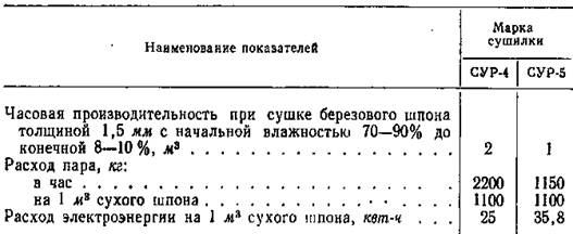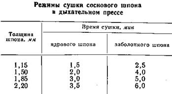 Режимы сушки соснового шпона в дыхательных прессах при давлении 5—6 ати приведены в таблице.