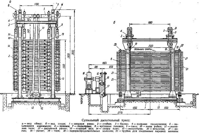Принцип действия дыхательного сушильного пресса заключается в том, что обогреваемые паром стальные плиты, укрепленные горизонтально на подвижных металлических штангах, получающих движение от связанного с электродвигателем эксцентрикового механизма, имеют переменно-возвратное движение. Движение плит рассчитано так, что половина промежутков открыта и находится под выгрузкой и загрузкой, а половина закрыта и осуществляет контактную сушку шпона. При таком способе шпон быстро прогревается, а при расхождении плит испаряет влагу со всей поверхности листа без разрывов из-за чрезмерных напряжений.
