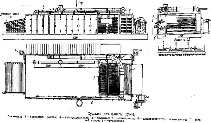 Роликовые сушилки относятся к конвекционным сушилкам непрерывного действия, в которых шпон движется между двумя рядами приводных роликов.