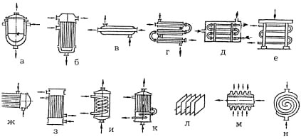 а — рубашечные, б — кожухотрубные; в — элементные однокорпусные; г — элементные многокорпусные; д — погружные; е — оросительные; ж — трубчатые горизонтальные; з — вертикально-кожухотрубные; и — змеевиковые; к — комбинированные; л — пластинчатые, м — ребристые; н — спиральные