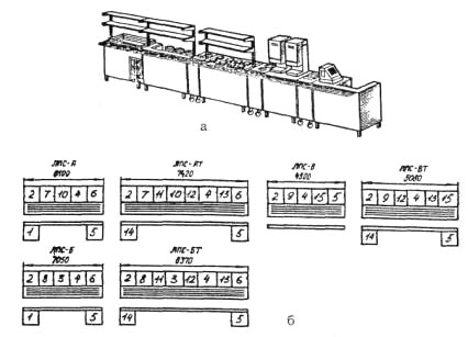 Линия ЛС-А (рис. 1.3, а, б) состоит из комплекта оборудования, размещенного в принятом порядке, для реализации кулинарной продукции с использованием функциональных емкостей. В начале линии устанавливается холодильный прилавок-витрина 8, в конце — прилавок-касса 1. Отдельные секции оборудования ставятся на пол и соединяются одна с другой, но без дополнительного крепления. Прилавок 2 для горячих напитков ЛПС-5 с термостатом 3 и мармит стационарный МСЭ-84 4 устанавливаются на подставки. Котлы передвижные КП-40, КП-60 7, мармит передвижной МП-28 б, шкаф тепловой передвижной электрический ШТПЭ-1 5, тележки ТВС-120-01, ТВТ-120 9 и ТВТ-240 10 закатываются в отсеки, ограниченные с трех сторон двумя прилавками и вставками, состоящими из столов, каркасов и облицовок. Передвижное оборудование в отсеках можно менять местами или заменять другим из сменного комплекта.