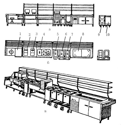 В линию входит следующее передвижное оборудование: мармиты для отпуска вторых 6 и первых 7 блюд, тележки для тарелок 8, стаканов 9, хлеба 10, холодных закусок 11. На раздаточной стойке установлен термостат 3 для горячих напитков. Подносы находятся на тележке 1, а столовые приборы — на тележке 4.