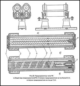 Патрон ПК вставляется в контакты, укреплённые на опорных изоляторах (рис. 20, а). В зависимости от номинального тока в предохранителях может быть один, два, четыре патрона (ПК1, ПК2, ПК4).