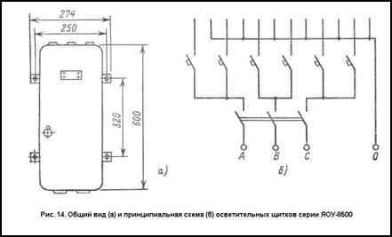 Осветительные групповые щитки типов ЯОУ-8501, ЯОУ-8504 (рис. 14) предназначены для распределения электроэнергии, защиты от перегрузок и токов короткого замыкания осветительных сетей. Они применяются в трёхфазных сетях переменного тока напряжением 380/220 В с глухозаземлённой нейтралью и могут служить для нечастых (до шести в час) оперативных включений и отключений электрических цепей.
