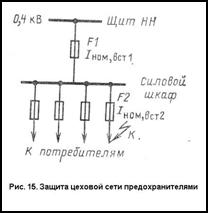 На (рис. 15) изображена схема защиты электрической сети предохранителями. При КЗ в точке К раньше других должна расплавится плавкая вставка предохранителя F2, имеющая меньший номинальный ток. По условию селективности защитная характеристика ближайшего к источнику питания предохранителя F1, должна располагаться над характеристикой более удалённого по схеме предохранителя F2. Как правило,