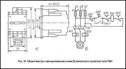 Магнитный пускатель представляет собой трёхполюсной контактор переменного тока прямоходовой магнитной системой, в которой дополнительно встроены два тепловых реле защиты, включенных последовательно в две фазы главной цепи электродвигателя. На (рис. 16 а и б) показаны общий вид пускателя ПМЛ и схема управления электродвигателем с помощью магнитного пускателя типа ПМЛ.