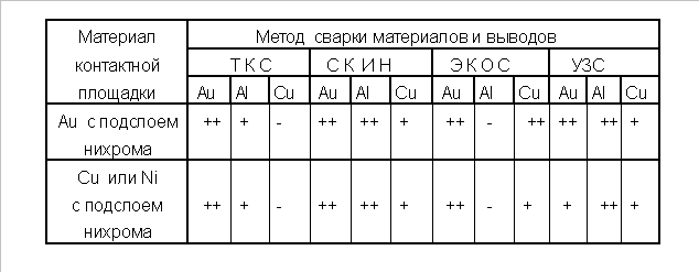 Предпосылками для получения качественного сварного соединения методом термокомпрессионной сварки являются: высокая пластичность проволоки, а также высокая взаимная диффузия в твердой фазе свариваемых материалов. В соответствии с этим предпочтительными материалами для выводов являются золото и алюминий. При сварке Au и Al в результате взаимной диффузии и нагрева возможно образование интерметаллических соединений (AuAl2, Au2Al? AuAl и др.) некоторые из них хрупкие и рыхлые, что снижает прочность соединений.