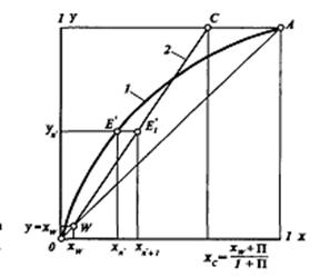 - уравнение рабочей линии. Устанавливает зависимость между концентрациями встречных потоков пара и жидкости в произвольном сечении колонны. П – паровое число.