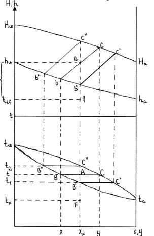 - т.а, A. В этой точке система будет состоять из жидкой и паровой фаз, составов x и y. Составы и энтальпии жидкости и пара определяются т.b, B, C, c.