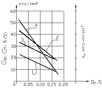 Рис. 3.3 Влияние кислорода на механические свойства стали |