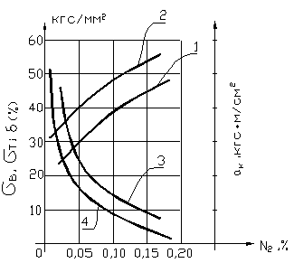Азот является вредной примесью, влияя на механические свойства стали (рис.3.4). Нитриды выделяются из твердого раствора a-железа не только при затвердевании, но и с течением времени, вызывая процесс старения.