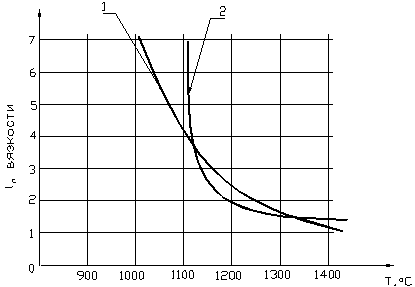 Рис. 5.2. Кривые перехода шлака в твердое состояние из жидкого 1–шлак с нормальным температурным интервалом; 2–шлак с коротким температурным интервалом. |
