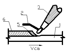 а – газовая; б – дуговая; 1 – свариваемое изделие; 2 – присадочный металл; 3 – сварочная горелка; 4 – электрод; 5 – жидкий металл; 6 – наплавленный металл | ||