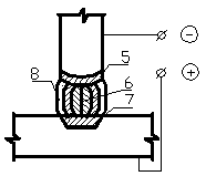 а – короткое замыкание; б – ионизация воздуха; в - установившаяся сварочная дуга; 1 – электрод (катод); 2 – анод (изделие); 3 – электроны; 4 – ионы; 5 – катодная область; 6 – столб дуги; 7–анодная область; 8–ореол | ||