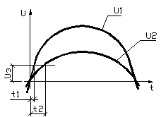 Здесь t – время восстановления дуги, т.е. время необходимое для восстановления напряжения от 0 до U зажигания дуги. Чем меньше t, тем спокойнее и устойчивее горит дуга. С повышением напряжения уменьшается время восстановления дуги (рис.2.6,а) (U1>U2; t1<t2), но напряжение не должно превышать безопасных значений для промышленной частоты (70-80 B). Условия зажигания дуги (рис. 2.6,б) переменного тока очень зависят от сдвига фаз между U и I. Угол сдвига фаз должен быть таким, чтобы в момент перехода тока через нулевое значение напряжение трансформатора U достигало напряжения зажигания дуги Uд.