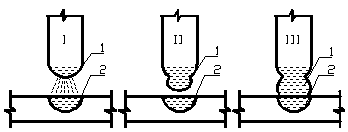 Рис. 2.11. Механизм переноса электродного металла в ванну 1 – жидкий металл электрода; 2 – жидкий металл ванны |