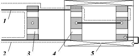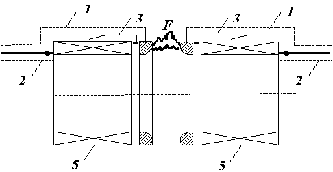 1 - путь тока при включенном положении аппарата, 2 - путь тока в процессе отключения, 3 - главные контакты, 4 - дугогасительные контакты, 5 - катушка.![]()