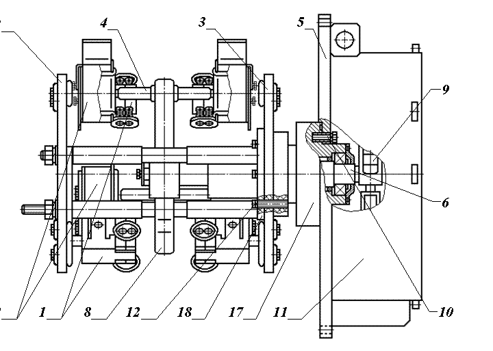 1-неподвижный контакт; 2-дугогасительная катушка; 3-диск; 4-подвижный контакт; 5-фланец; 6-главный вал; 7-шины; 8-траверса; 9-главный рычаг; 10-болт; 11-коробка механизма; 12-болты; 13,14-ламели; 15-пружина; 16-ввод; 17-корпус; 18-стойка.