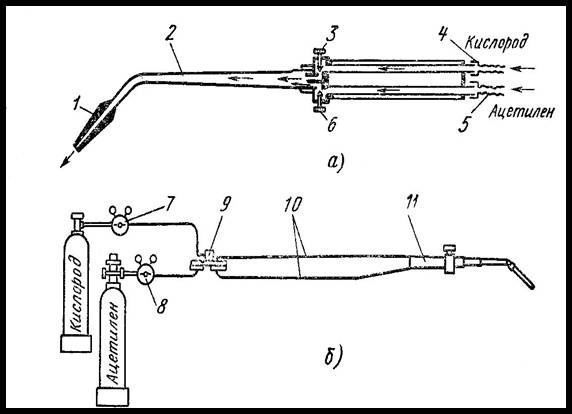 1 — мундштук; 2 — трубка наконечника; 3 — вентиль кислорода; 4 — ниппель кислорода; 5 — ниппель ацетилена; 6 — вентиль ацетилена; 7 — редуктор кислородный; 8 — редуктор ацетиленовый; 9 — регулятор ДКР; 10 — шланги; 11 — горелка ГАР