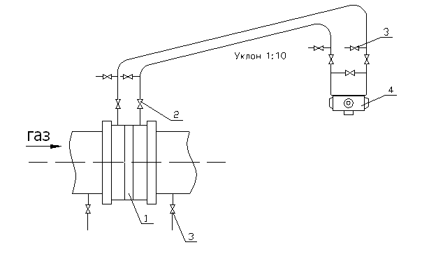 При измерении расхода природного газа, в соответствии с заданием на курсовую работу, следует установить дифманометр 4 выше сужающего устройства 1. Необходимо выполнить уклон 1:10 на всем продолжении горизонтальных участков импульсной линии в сторону отборного устройства. Для продувки системы на импульсных линиях устанавливаются продувочные вентили 3. Продувочные вентили устанавливаются также во всех наивысших точках соединительных линий в случае невозможности выполнения одностороннего уклона. Прекратить отбор давления можно либо при помощи вентилей 2, либо при помощи уравнительного вентиля, если он есть.