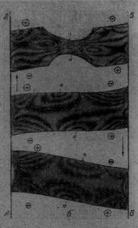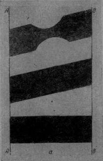 а – расположение резиновых пластин между параллельными планками АА и ВВ; б – картина изохром (стрелками показано направление сдвига); О – нулевые точки, Å и Q - зоны растягивающих и сжимающих напряжений.