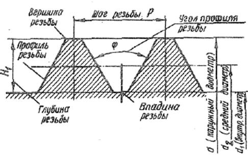 У всякой резьбы различают следующие основные элементы: про филь; угол и высоту профиля; шаг; наружный, средний и внутренний диаметры резьбы.