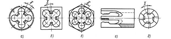 Рис. 2 Резьбонарезные плашки: а — круглая, б — квадратная, а — шестигранная, г, д — трубчатая, •у — передний угол