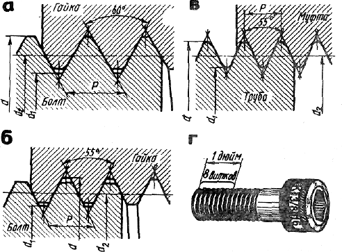 Рис. 4. Резьбы метрическая (а), дюймовая (б), трубная (в) и деталь с дюймовой резьбой (г)