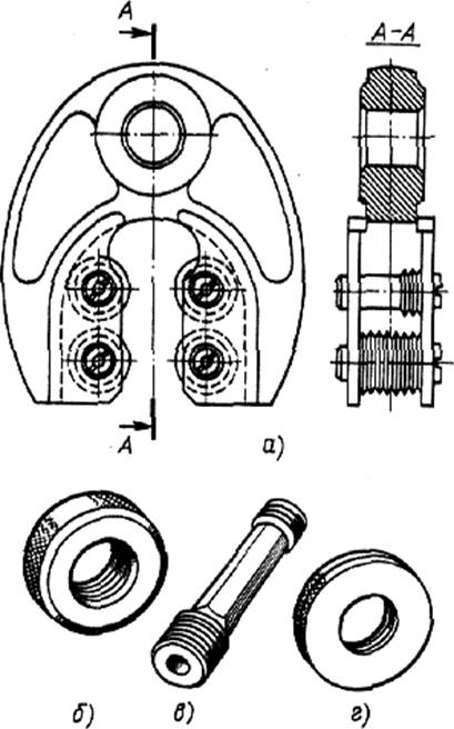 а—предельная резьбовая роликовая ско ба, б—проходное кольцо, в — резьбовой калибр, г — непроходное кольцо