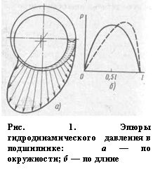 Вращающийся вал под действием внешней нагрузки занимает в подшипнике эксцентричное положение. Масло увлекается в клиновой зазор между валом и вкладышем и создает гидродинамическую поддерживающую силу (рис. 1, а) Гидродинамическое давление по длине подшипника распределяется неравномерно (рис. 1, б). При отсутствии начальных и упругих перекосов цапфы в подшипнике давление масла вследствие торцового истечения изменяется по параболе с показателем степени 2,2 .2,3 и снижается до нуля у концов подшипника. При перекосах эпюра распределения давления становится несимметричной (штриховая линия на рис. 1,6).