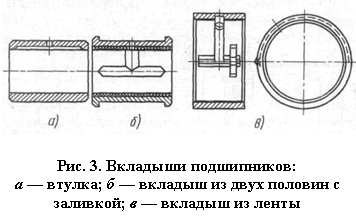 Вкладыши в неразъемных подшипниках изготовляют в виде втулок (рис. 3, а), а в обычных разъемных подшипниках — из двух половин (рис. 3, б).