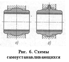 Для уменьшения влияния перекосов целесообразно применять самоустанавливающиеся подшипники, в которых вкладыши выполняют со сферической опорной поверхностью, описанной из центра подшипника (рис.6, а). Иногда применяют опору в виде узкого пояска с малой угловой контактной жесткостью (рис. 6, б). Обычно самоустанавливающиеся подшипники применяют при невозможности точной установки, например, при монтаже на разных основаниях или при больших упругих деформациях валов.