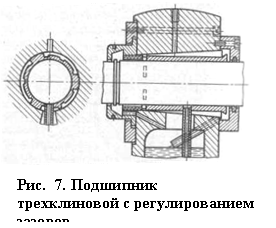 Неразъемные подшипники для валов с цилиндрическими цапфами регулируют путем радиального деформирования вкладышей (рис. 7). Для этого вкладыши выполняют с конической наружной поверхностью и при помощи гайки перемещают в осевом направлении в коническом отверстии корпуса. Вкладыш сжимается по трем образующим. Особенность конструкции подшипника заключается не только в тонком регулировании зазора, но и в создании в трех местах по окружности суживающихся зазоров, а следовательно, трех масляных клиньев, которые обеспечивают хорошее центрирование вала и безвибрационную работу.